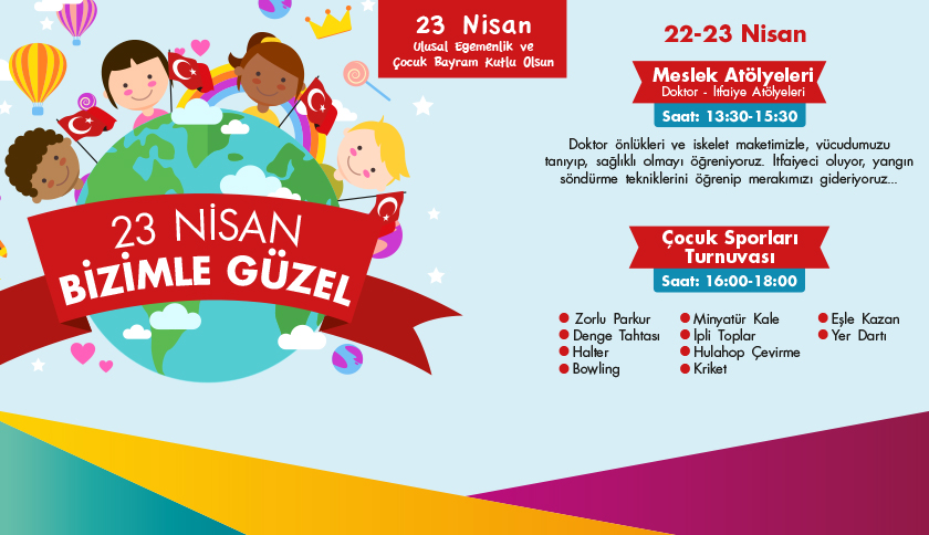 23 Nisan Bizimle Güzel9 Ocak 20189 Ocak 2018 Geçmiş22 – 23 Nisan tarihleri arasında Meslek Atölyeleri – 13.30 – 15.30 Doktor önlükleri ve iskelet maketimizle vücudumuzu tanıyıp, sağlıklı olmayı öğreniyoruz. Çocuk Sporları Turnuvası 16.00 – 18.00