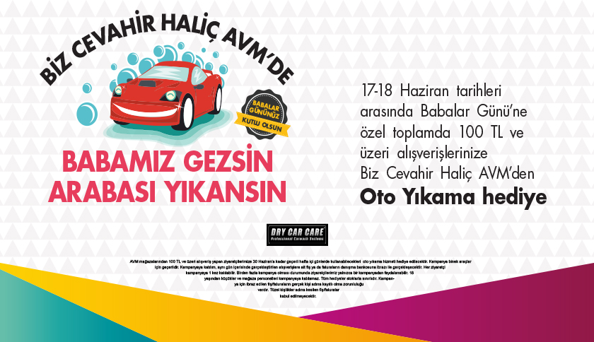 Babamız Gezsin Arabası Yıkansın17 Haziran 20179 Ocak 2018 Geçmiş17 – 18 tarihleri arasında Babalar Gününe Özel toplamda 100 TL ve üzeri alışverişlerinize Biz Cevahir AVM’den oto yıkama hediye!