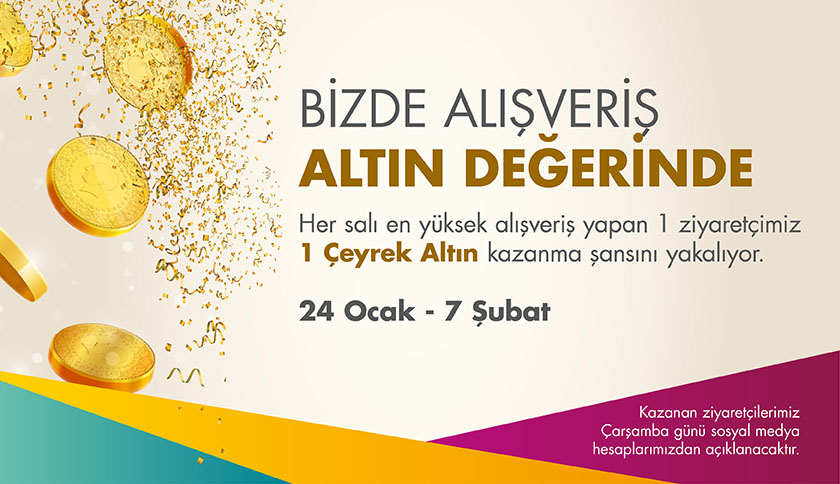Bizde Alışveriş Altın Değerinde24 Ocak 20179 Şubat 2017 GeçmişHer salı en yüksek alışveriş yapan 1 ziyaretçimiz 1 çeyrek altın kazanma şansını yakalıyor.